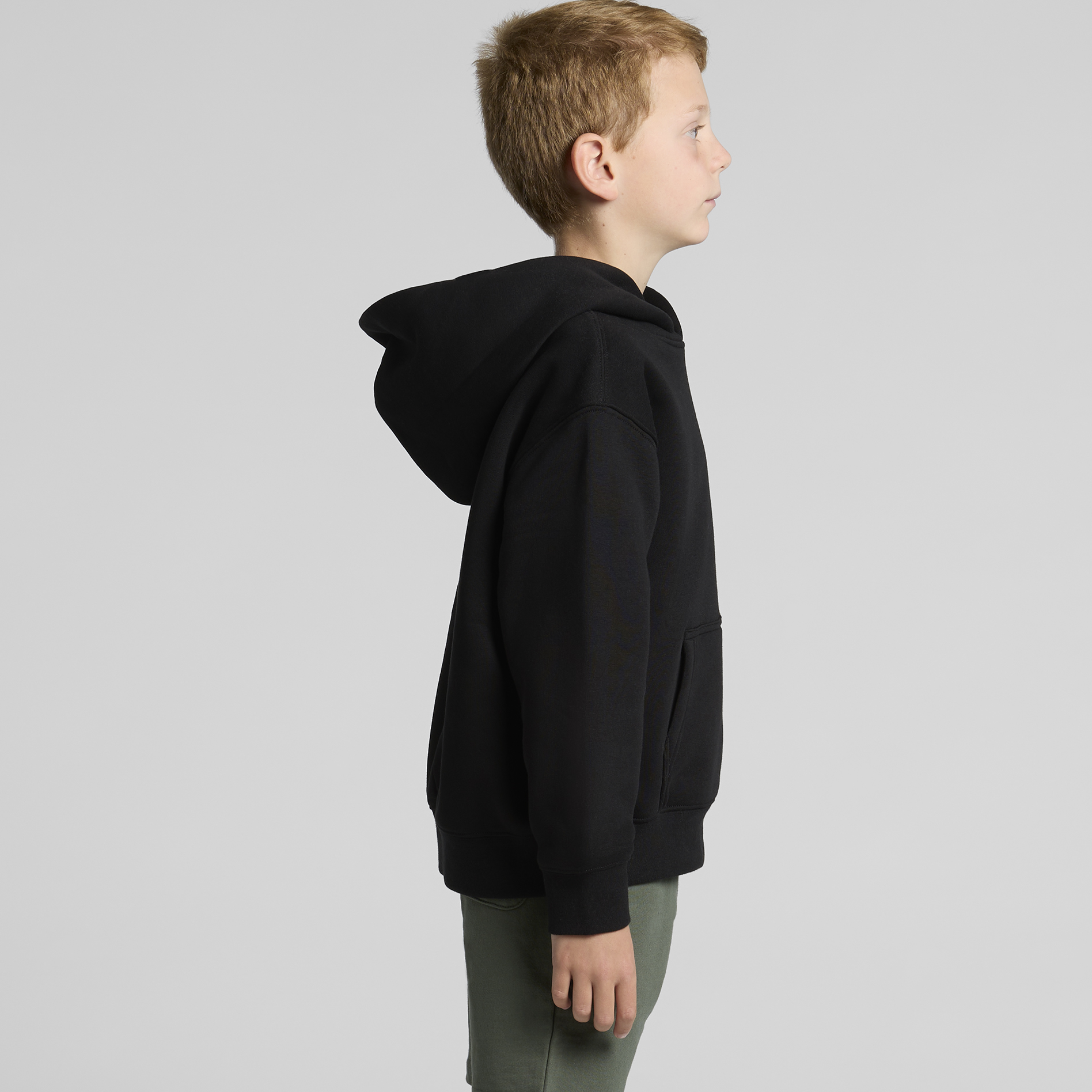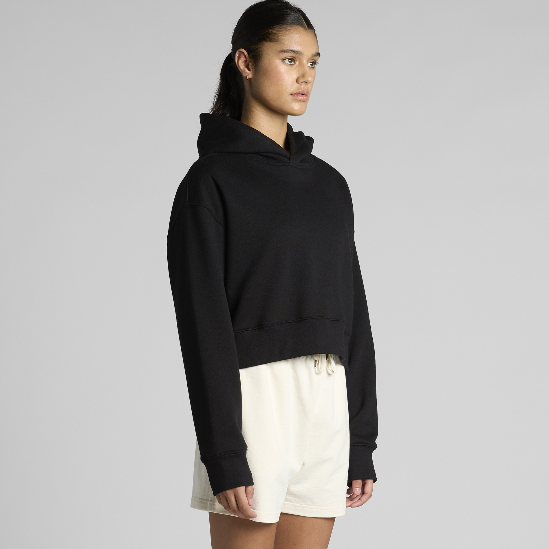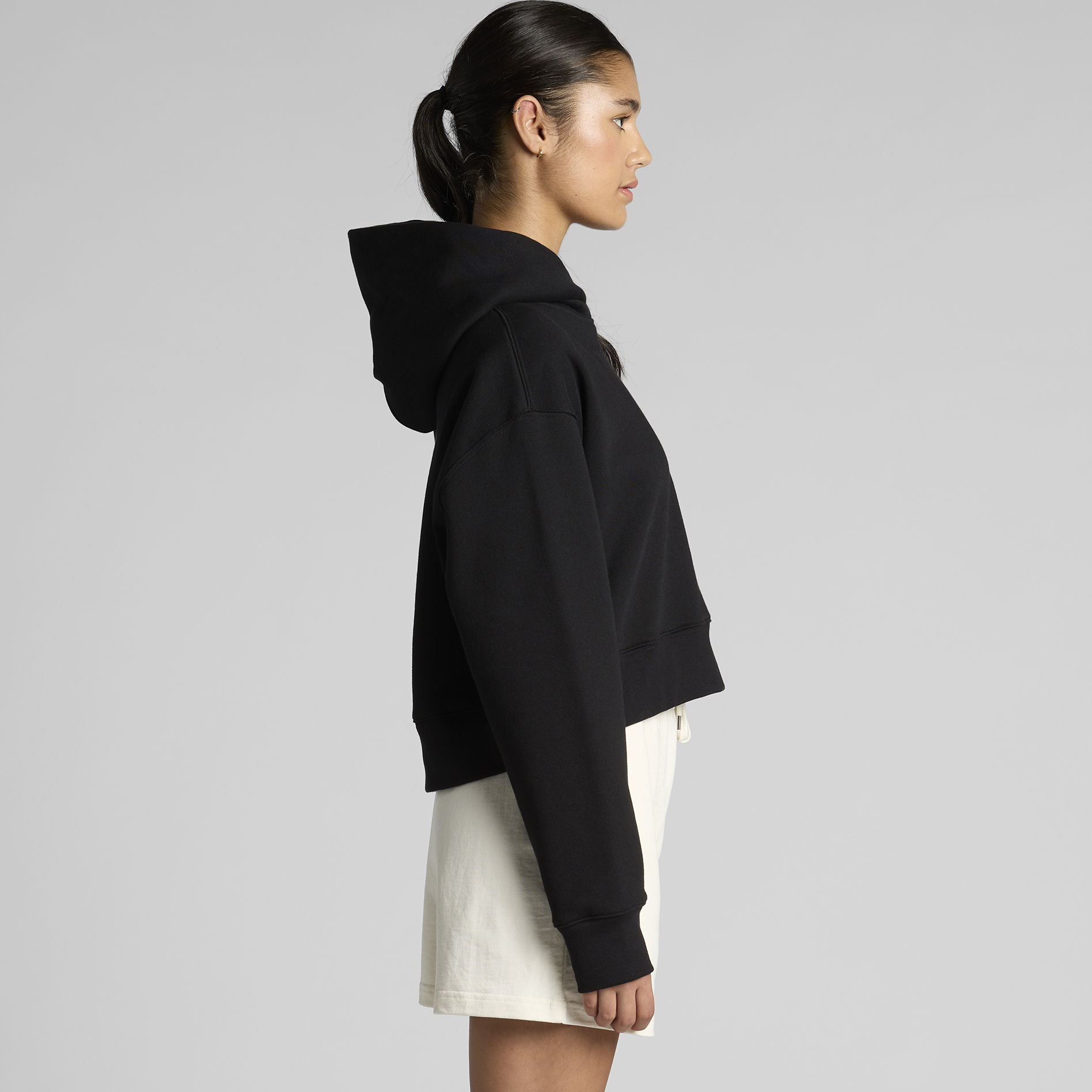 Pre-shrunk to minimise shrinkage, pullover hood, drop shoulder, cropped full length, self-fabric lined hood, no drawcord, sleeve cuff ribbing